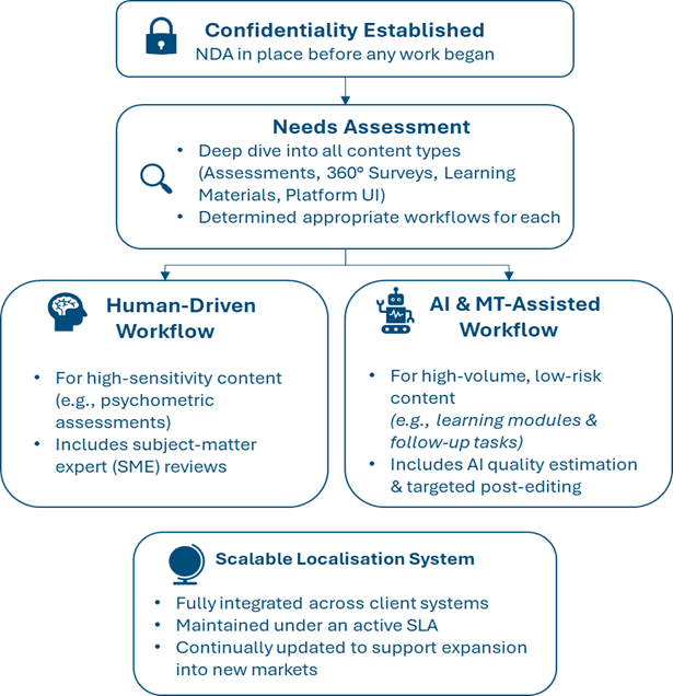 An organisation specialising in Executive Development issued an RFP to localise their entire portfolio into 7 European languages. Their portfolio includes leadership assessments, 360° and pulse surveys, learning materials and follow-up activities, and the user interface of their executive development platform. They sought to partner with someone who could confidently manage diverse content types, applying differentiated workflows to maintain quality and consistency, while leveraging different technological efficiencies.