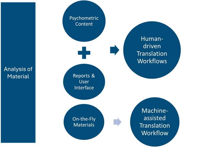 Assessments with psychometric properties or surveys subject to meaning shift without due consideration for context and scope were sent through a rigorous human translation workflow.