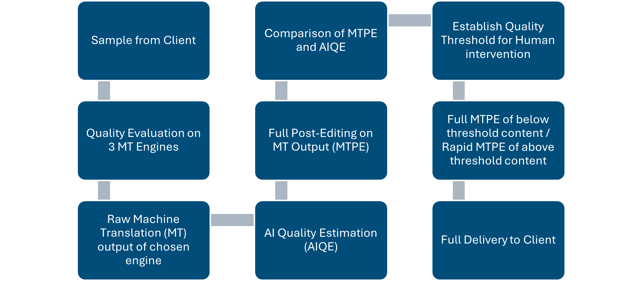 As a first step, a sample of the learning materials was run through three different MT systems and evaluated by human translators in terms of accuracy and fluency. This allowed us to select the MT engine per target language, as not all languages have similar quality outputs across all commonly used engines. Once the most suitable MT was selected, a larger sample was run first through the selected MT and then through an AI Quality Estimation (AIQE) tool, COMET, to evaluate the quality of the MT output on a scale of 0 to 1. This translation was post-edited to human-quality output by our trained linguists and the edit distance of their work was compared against the AIQE score to create a quality threshold.