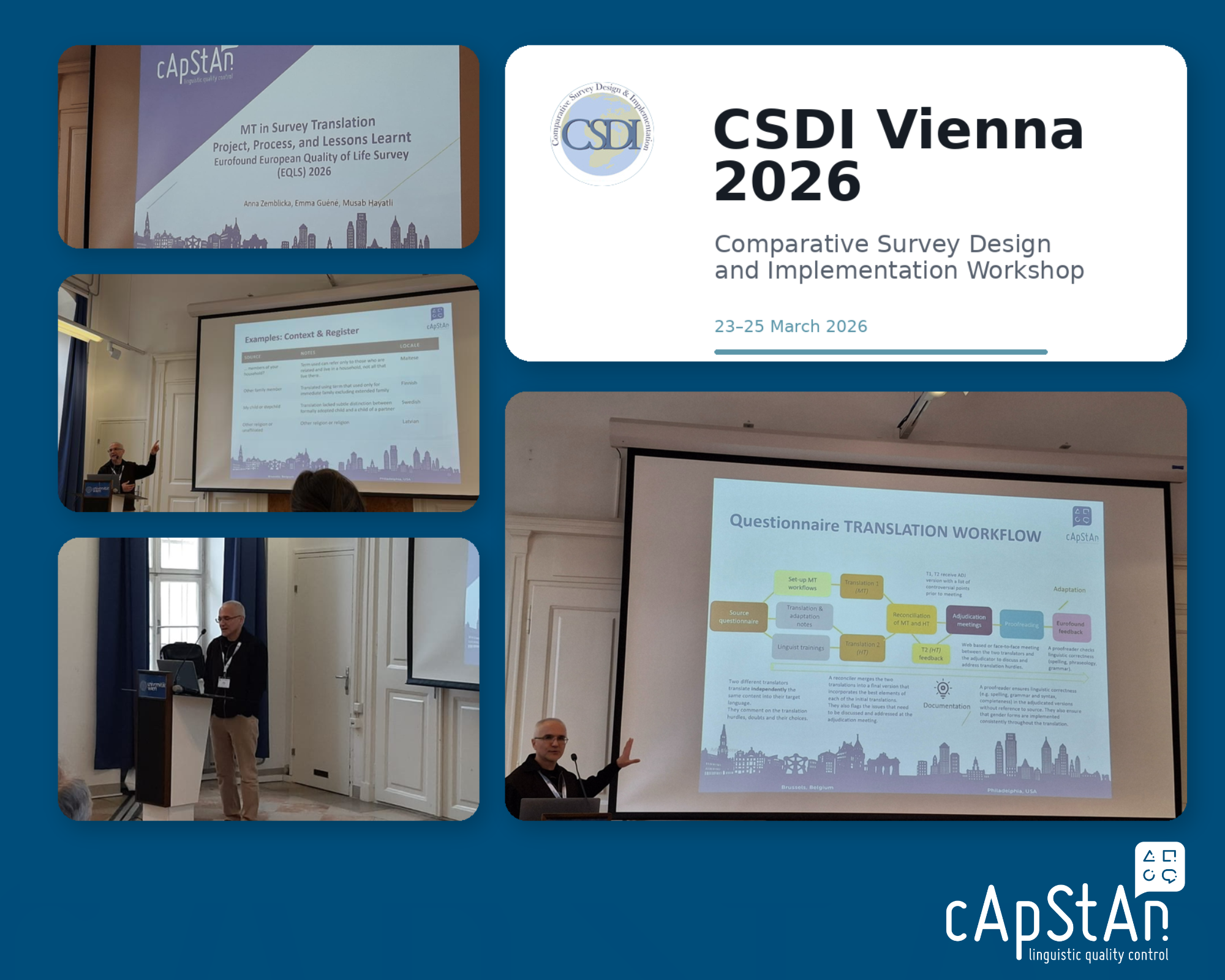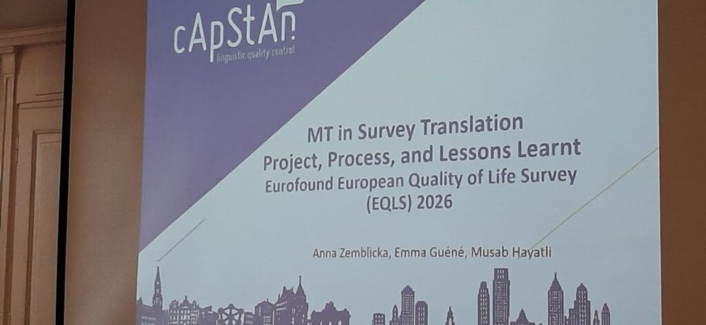 Our colleague Musab Hayatli contributed to the session Advances in Translation and Questionnaire Design, where he showcased cApStAn’s latest work on technological approaches to translation. His presentation, Integrating technological advances and established translation methodology: A hybrid approach to TRAPD, outlined how new tools—including LLM‑supported processes—can be responsibly incorporated into the trusted TRAPD framework, strengthening linguistic quality assurance while preserving expert judgement, contextual sensitivity, and cross‑cultural validity.