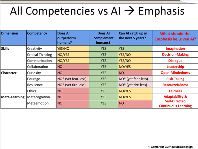 Charles Fadel, the Founder and chairman of the Center for Curriculum Redesign (CCR), followed suit with his usual brand of keynote: striking images and data visualisations drawn from multiple sources, a rapid-fire combination of high-level history of technology, including generative AI, and projections leading to the presentation of CCR’s 4D Framework: robust psychometric research underpins embeddings of competency dimensions into the different knowledge strands, and a summary of the status of each competency with regard to AI.